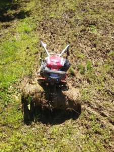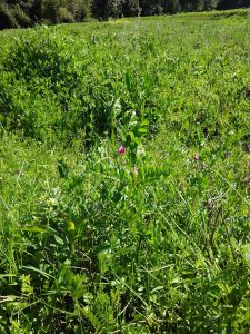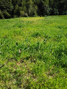 貧弱な花が咲いているのが三陸つぼみ菜。その両側にあるのか分からないのが春菊です。最初の年はくず大豆入れましたが、その後ずっと刈草ともみ殻だけで肥料分が抜けました。それでもヨモギとからすのえんどうみたいな雑草は生育旺盛です。ここで緑肥投入して蕎麦をします。