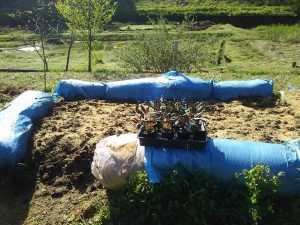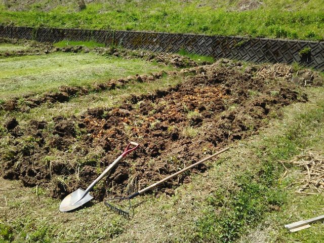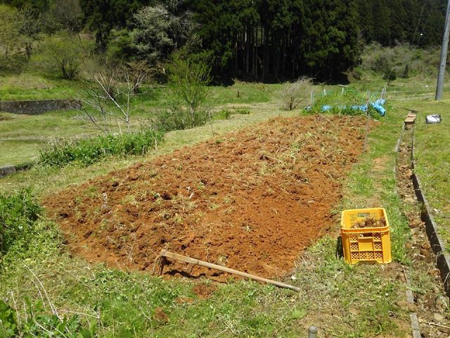 9時開始、11時45分終了。これで3mかける10mで30㎡です。約10坪ですが、カボチャだとつるが普通に3mくらい延びます。キクイモは全部でコンテナ2個分。去年の春に作った東井栗園さんからもらった栗のいがと落ち葉で作った踏み込み温床は多分堆肥になったと思うので、金時草の苗を定植します。外観を少し手直しします。