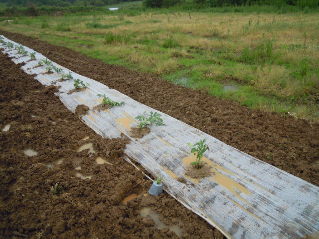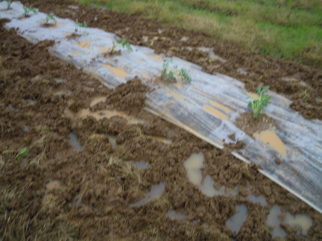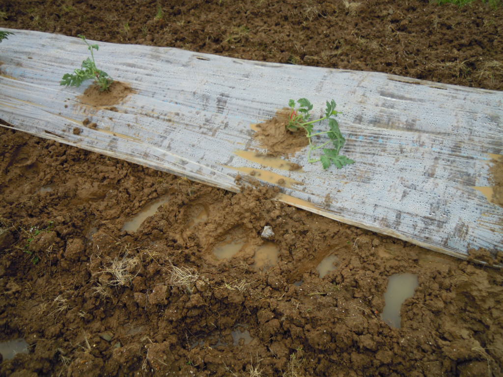 それで10アール分スイカの苗の定植作業をやったけど、ビニールの上にのせた土が土砂降りの雨でビニールの上を流れていくような状況でした。