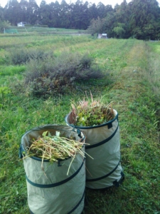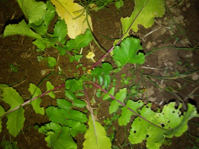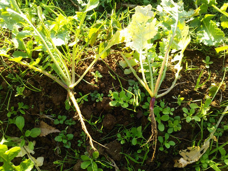数株だけど赤色のものが出来てました。茎まで真っ赤なので見分けがつきます。自家採取して増やすことにします。ここは東京農大(発)土の会に土壌分析を依頼した場所ですが、やせ地の雑草のスギナに覆われた中の畝に大根がある状態です。辛さを出すためにわざと無施肥で追肥もなしですが、親田辛味大根の味は信州でないと出ないらしいので上手く出きるか何とも言えません。それで美味しい味を追及するために北陸土の会で勉強中です。