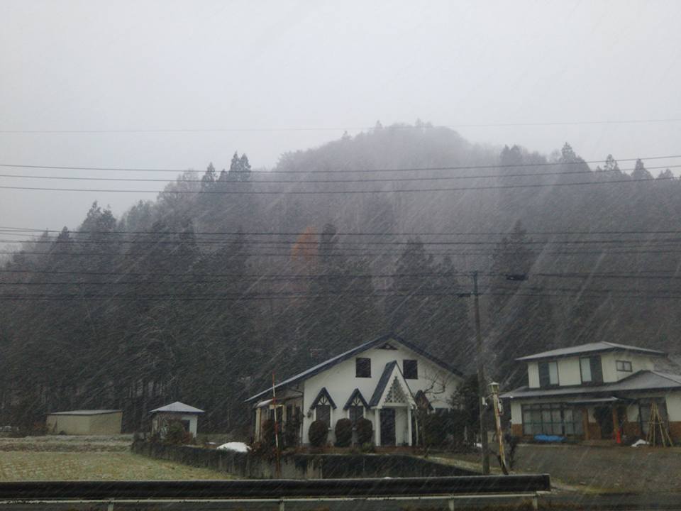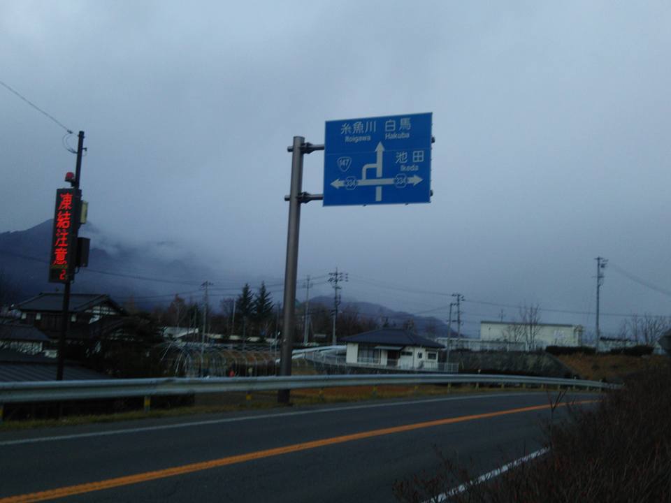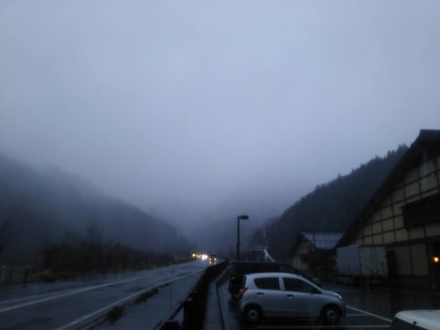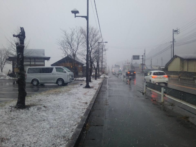 姫川温泉過ぎてから雨が湿った雪に変わった。