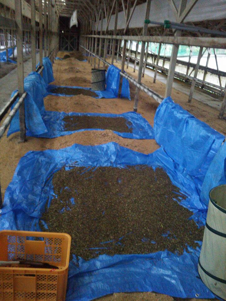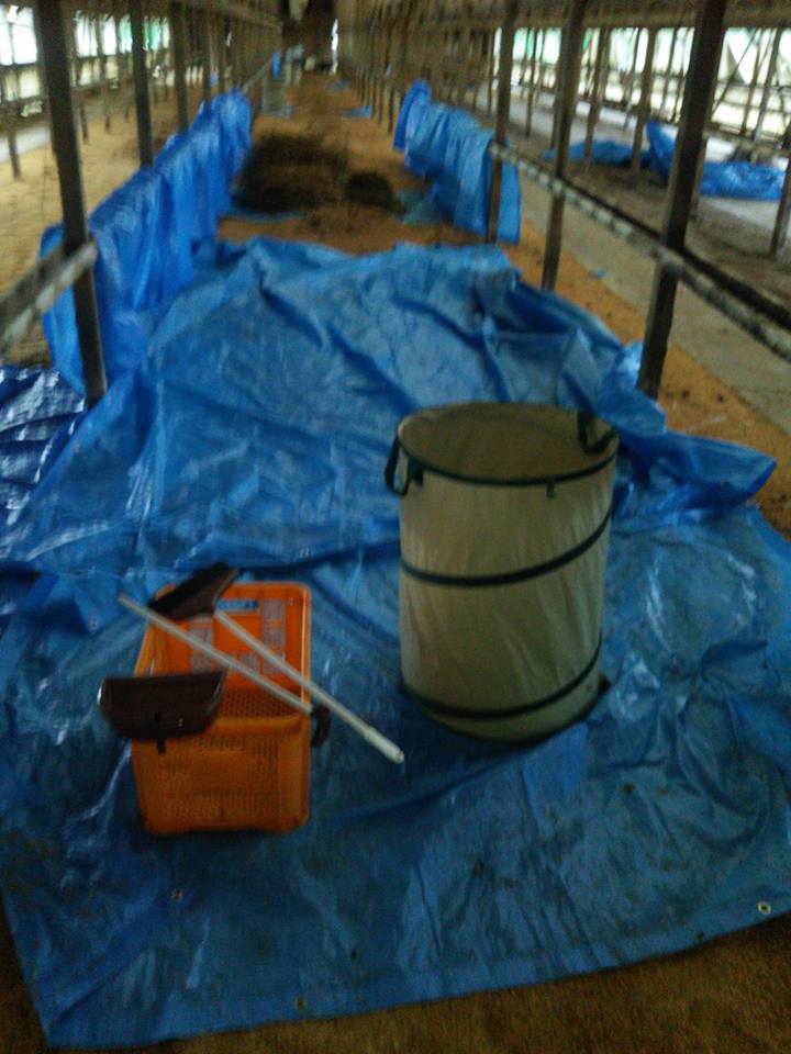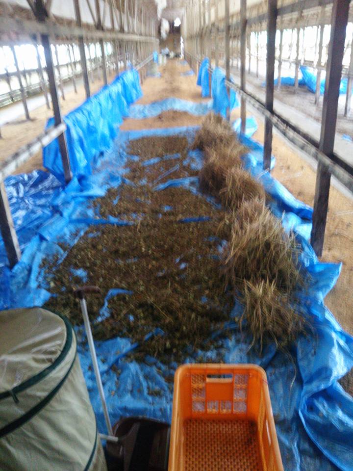 ビニールシートを敷いていた場所のもみ殻が湿気を吸って湿っていたので、隣の乾いているもみ殻の上にビニールシートを敷き直して広げています。