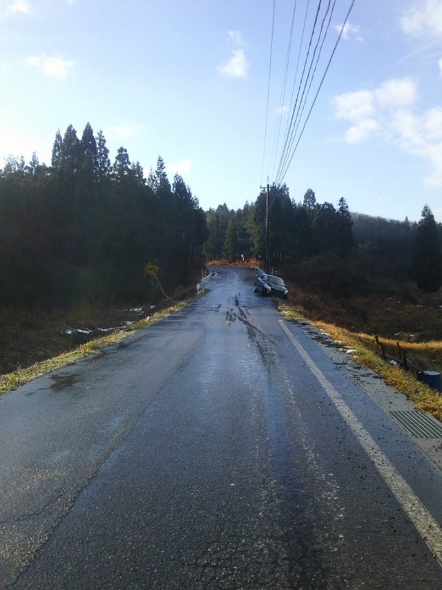 分かる人が見れば場所は分かると思うけど、濡れた路面が凍結でブラックバーン状態です。
