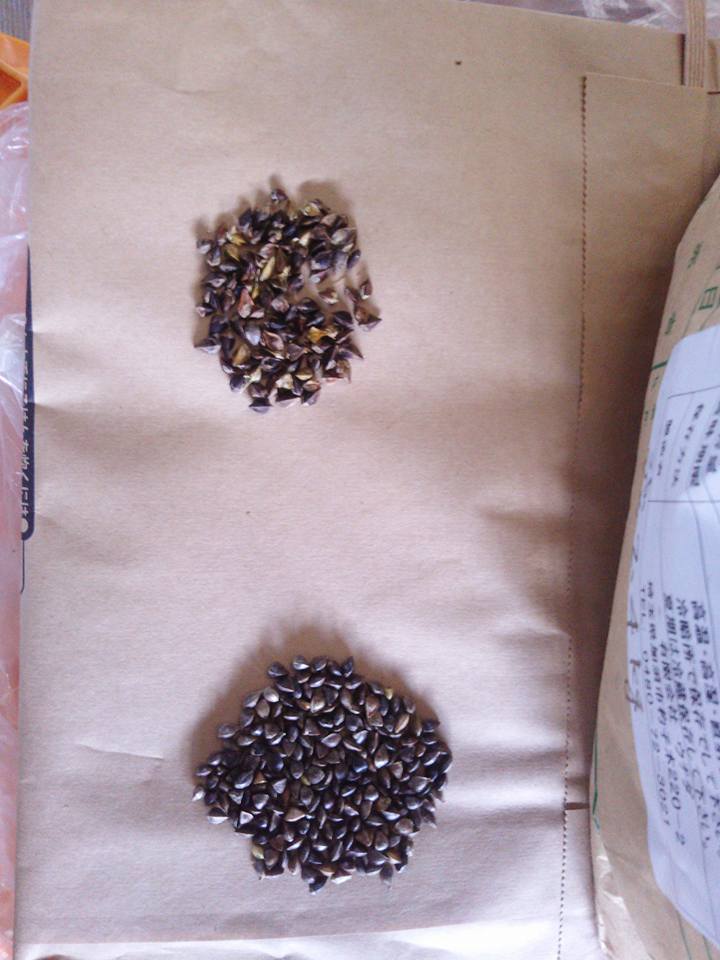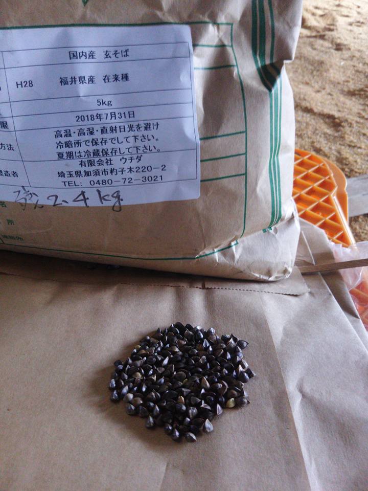 11時半から1時間で片付け終わり。蕎麦の水分が多いので、乾燥作業が終わるまでカビ防止で洗濯ネットに入れ直し。きちんと乾燥させると右の玄蕎麦みたいになるらしいということまでは、昨日教わってきました。