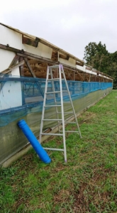 側面のシートが壊れているのは修復無理なので、引きずって移動させて隣の建物の穴があいたシートに重ねることに。今日は晴れてよかった。