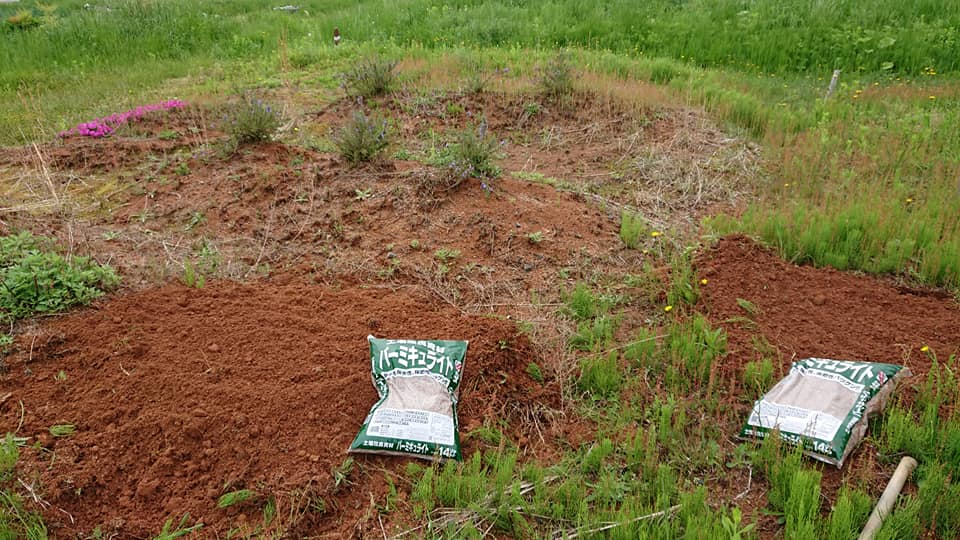 株分け増殖が目的です。前日にパーミキュライトを1袋ずつ植え穴に入れて、今日はもみがらを赤土に混ぜました。