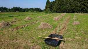 最後に刈草をうねに敷きました。