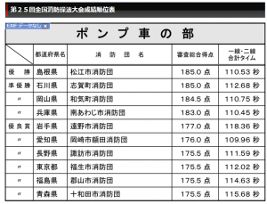 リンク先は、株式会社RISEの第25回全国消防操法大会 熱戦レポートです。前回大会は、ポンプ車の部で志賀町消防団が準優勝しました。画像はリンク先の記事からお借りしています。
