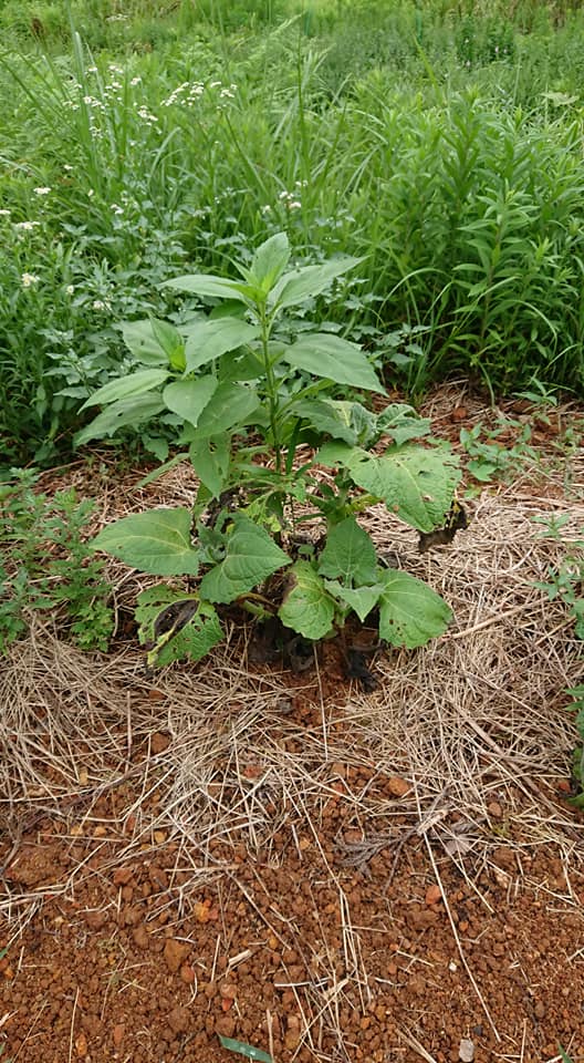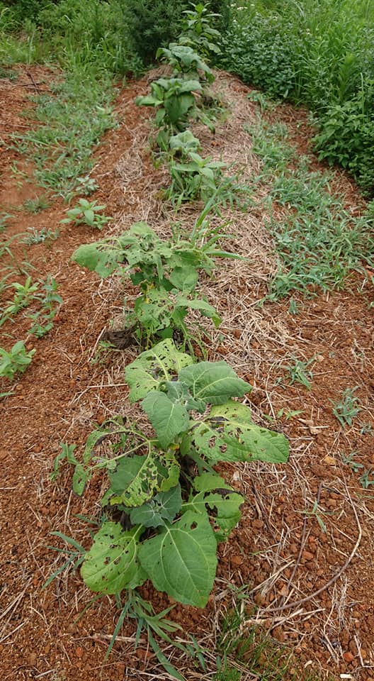 今日は午前中に久しぶりに雨が降ったので地面が湿ってます。ヤーコンは南米のアンデス山脈が原産地なので30度以上の高温には弱いです。今年は40度近い高温の日がずっと続いたせいか葉が枯れたり虫が食ったりしてます。