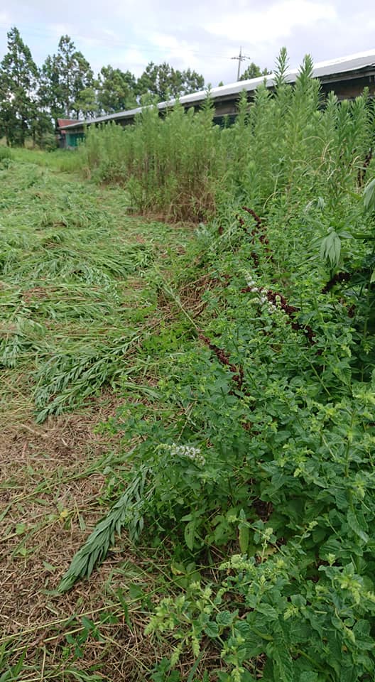 今も鶏ふんの匂いがわずかに残っているので、匂い消しとハエ避けに鶏舎の片面にアップルミントを植えてみました。痩せた地面ではセイタカアワダチソウに負けてます。