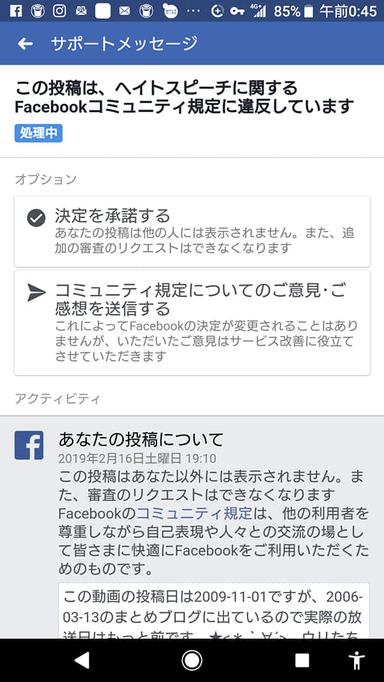 FB運営からやっぱりヘイトスピーチだと言われました。