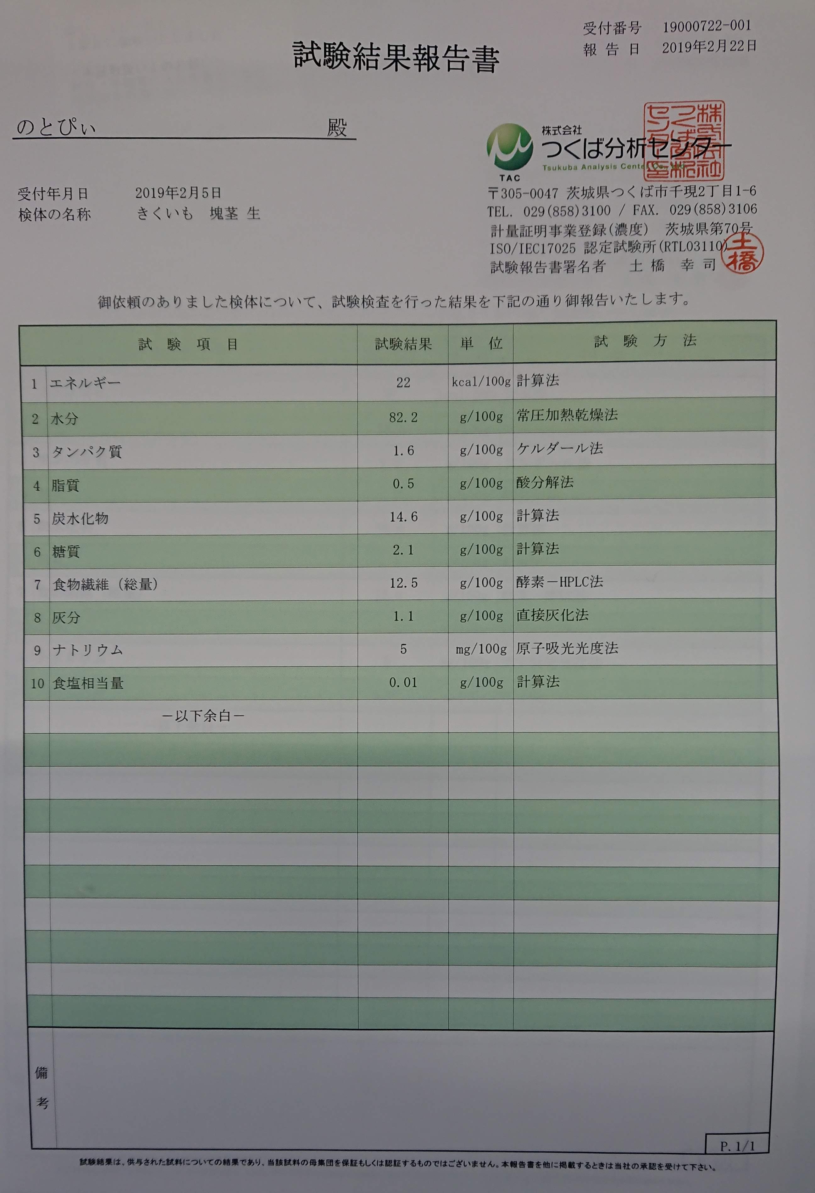 「きくいも」の分析結果の正式な報告書が届きました-2019-02-27