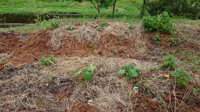 次は緑色だらけで分かりにくいと思いますが、この中に自家採取した2年目のヤーコンが混じっています。