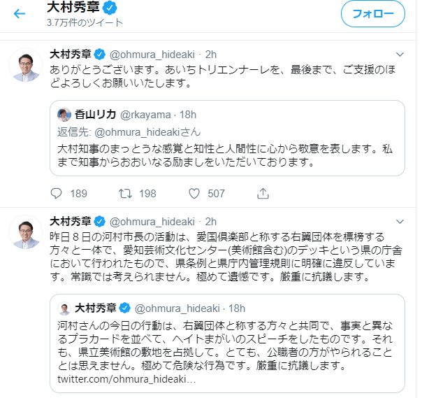 河村さんの今日の行動は、右翼団体と称する方々と共同で、事実と異なるプラカードを並べて、ヘイトまがいのスピーチをしたものです。それも、県立美術館の敷地を占拠して。とても、公職者の方がやられることとは思えません。極めて危険な行為です。厳重に抗議します。