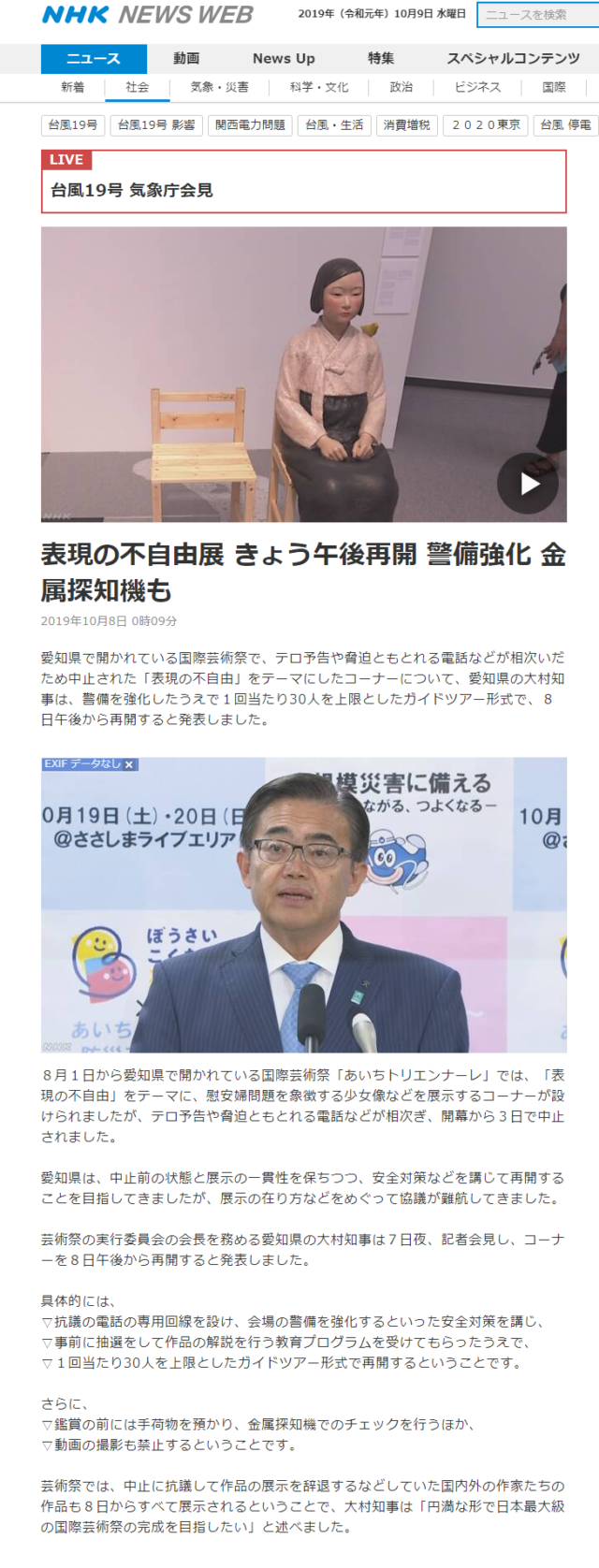 あいちトリエンナーレ「表現の不自由展」の再開で河村たかし名古屋市長と大村秀章愛知県知事がバトル-2019-10-09