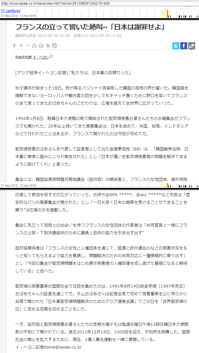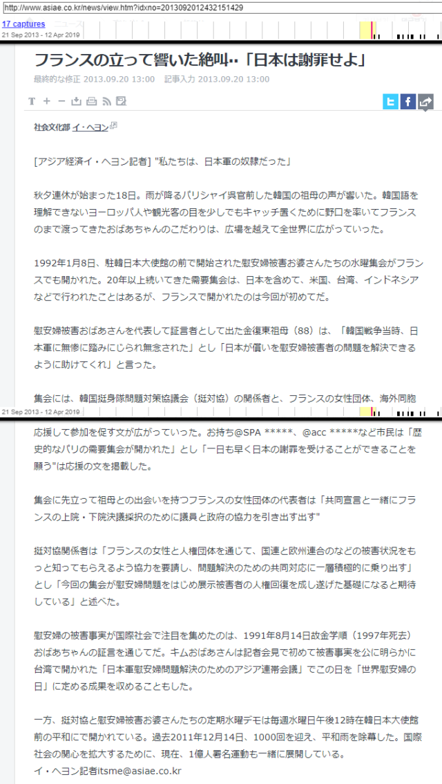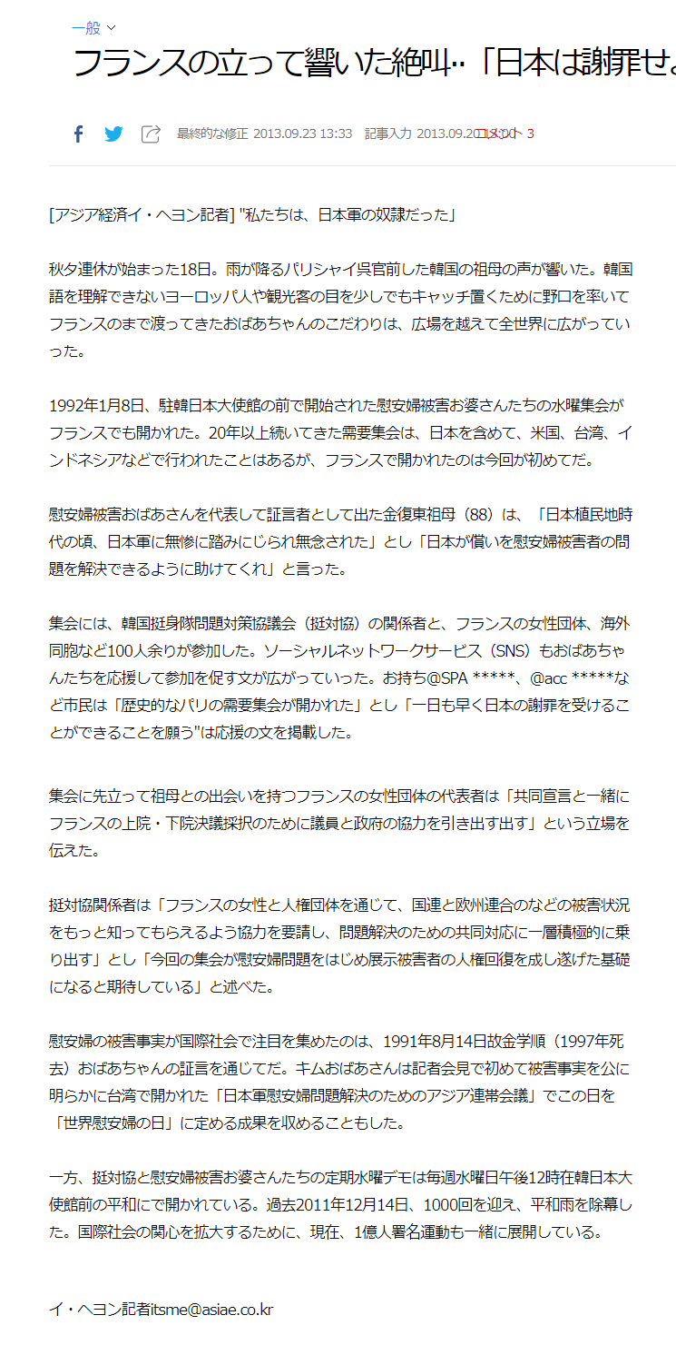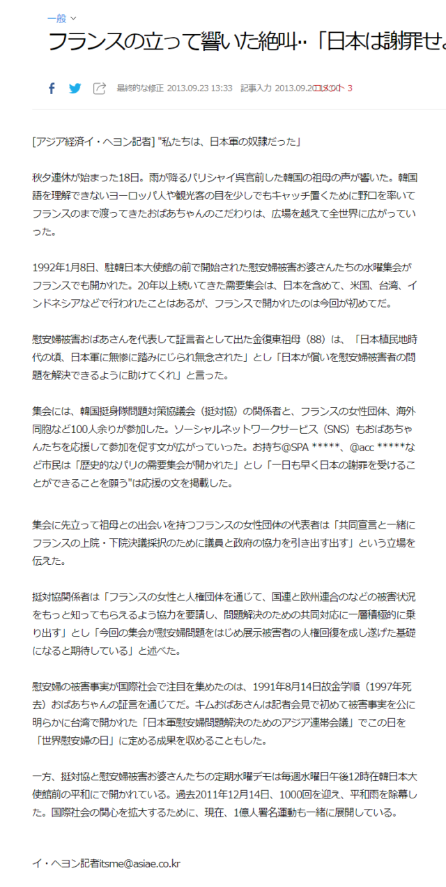 2013年にフランスで韓国の元慰安婦・金福童さんが「韓国戦争当時日本軍の性奴隷だった」と叫んだことが報道されました