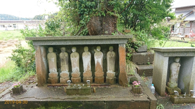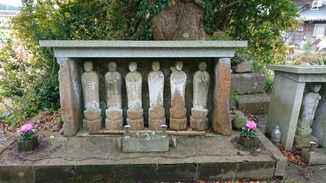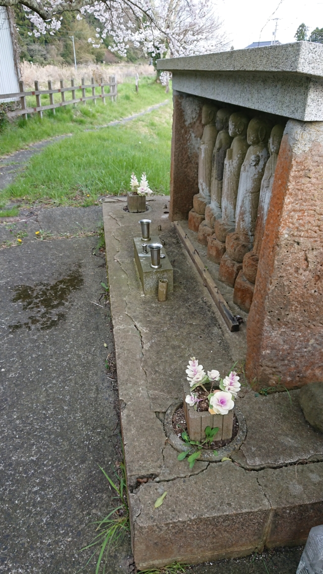 甲駅のそばにお地蔵さんがあります。後ろの大きな木は漆(うるし)の木です。漆の木は樹液が皮膚についたらかぶれるので要注意です。そのお地蔵さんの両脇にお供えの花を植える円形の場所がありますが、排水口がないのでそのまま花を植えても根腐れして枯れていました。