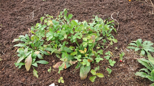最初にキューティボックスをどけて円形の植え穴の古い土も半分ほど取り除きます。春に植えた花の方はまだ生きているので、駅のホーム上の花壇に移植です。花壇の中央にあるのはワイルドストロベリーです。
