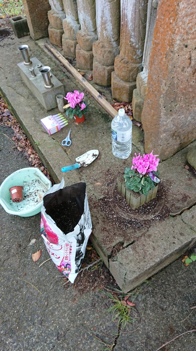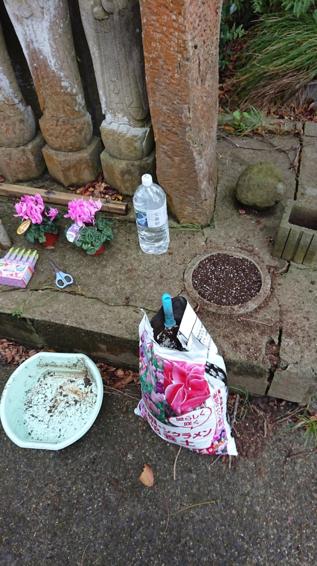 今年の冬のお地蔵さんのお供えの花はシクラメンにしました-2019-11-16