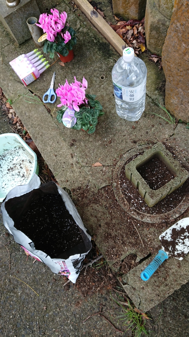 次に今年はシクラメンを植えるので、市販のシクラメン専用の培養土を植え穴につめます。キューティボックスにも半分ほどつめてからシクラメンの株を移植します。