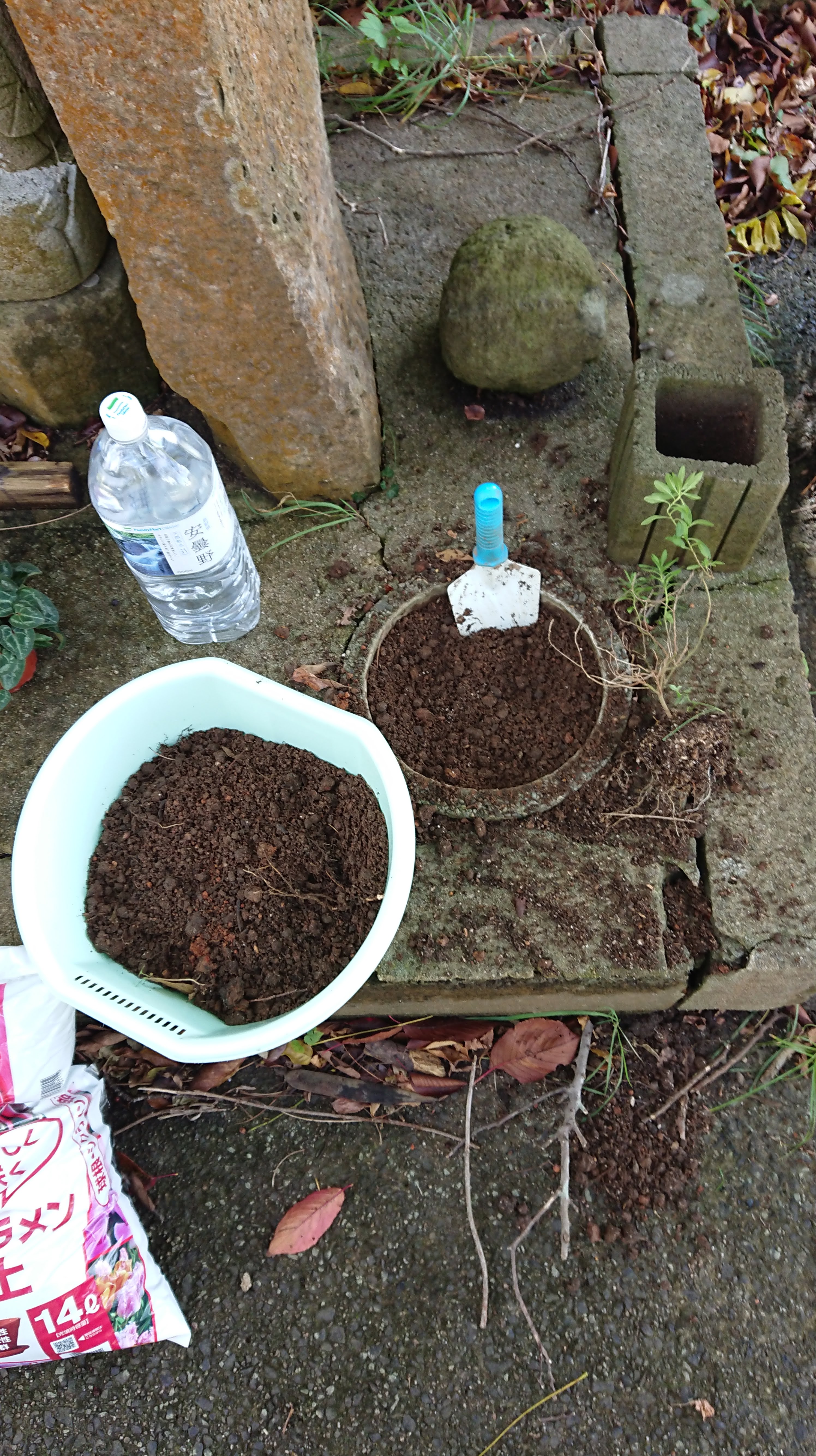 次に今年はシクラメンを植えるので、市販のシクラメン専用の培養土を植え穴につめます。キューティボックスにも半分ほどつめてからシクラメンの株を移植します。