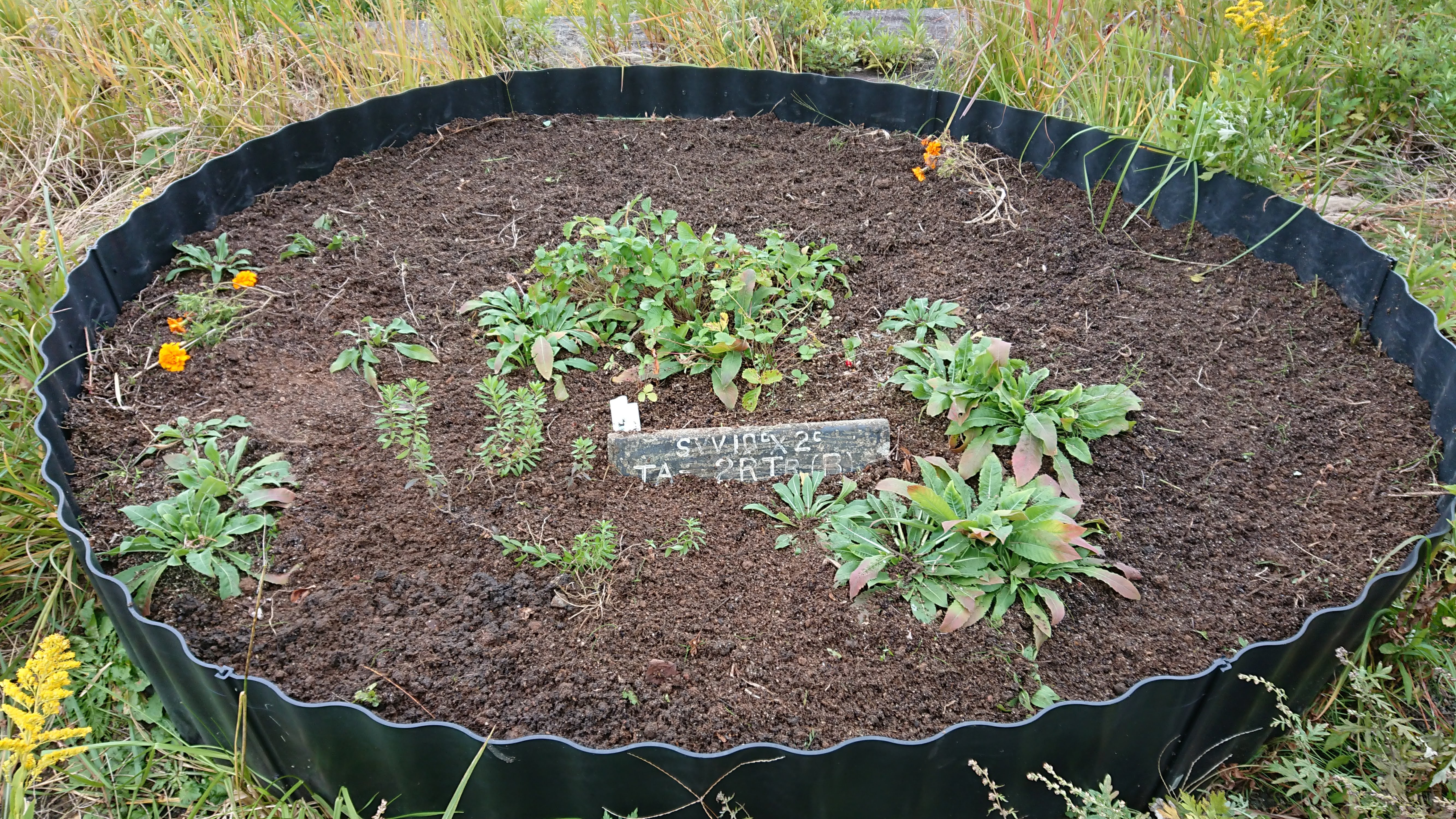 最初にキューティボックスをどけて円形の植え穴の古い土も半分ほど取り除きます。春に植えた花の方はまだ生きているので、駅のホーム上の花壇に移植です。花壇の中央にあるのはワイルドストロベリーです。