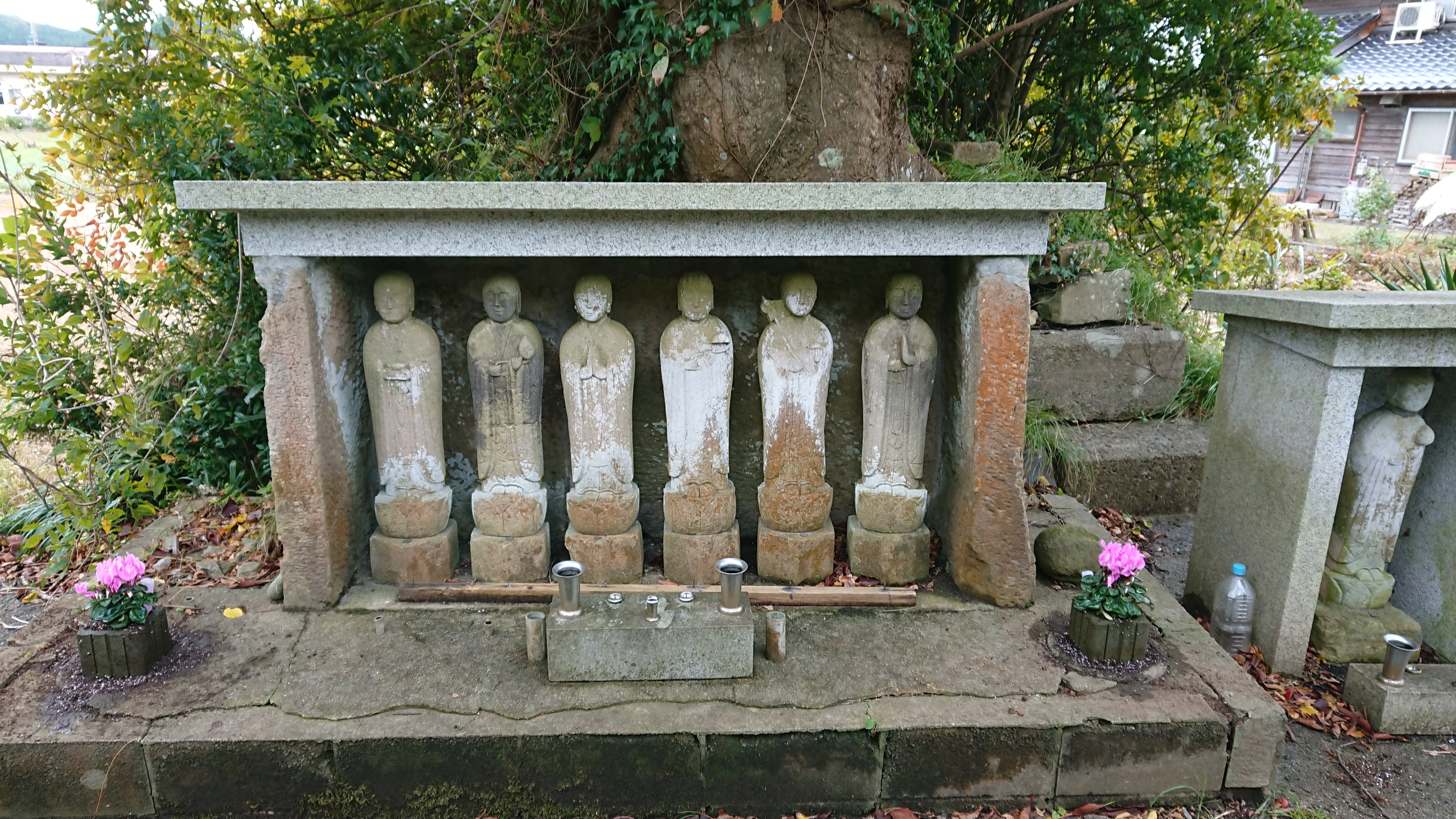 甲駅のそばにお地蔵さんがあります。後ろの大きな木は漆(うるし)の木です。漆の木は樹液が皮膚についたらかぶれるので要注意です。そのお地蔵さんの両脇にお供えの花を植える円形の場所がありますが、排水口がないのでそのまま花を植えても根腐れして枯れていました。