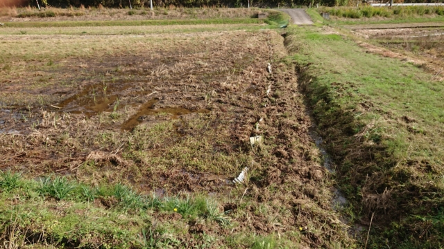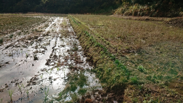 緑色の草が一列で並んで生えている部分が掘り起こされていないことが見てとれますが、ここは稲作を止めた耕作放棄地です。何年たってもあぜの部分はいのししに荒らされません。