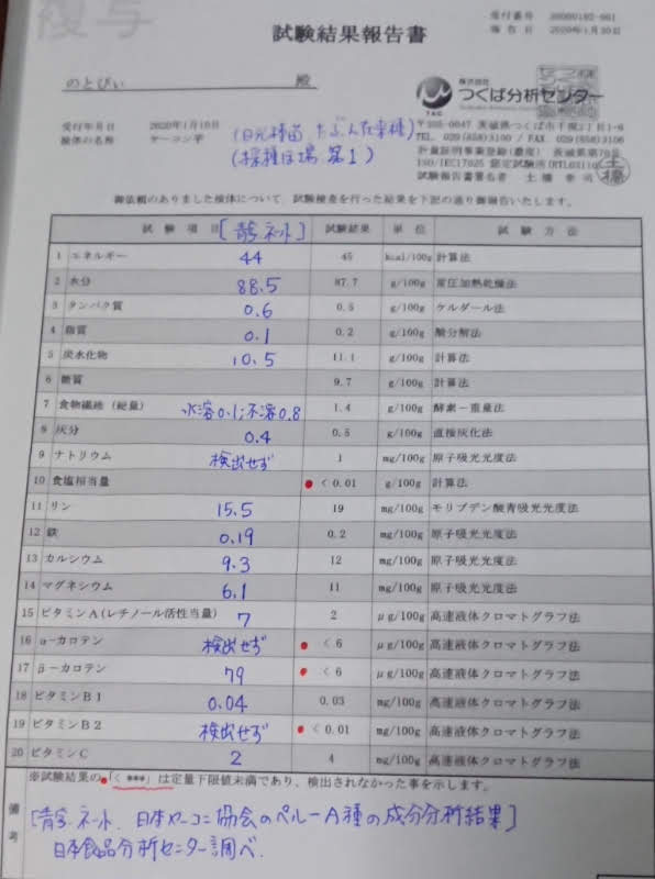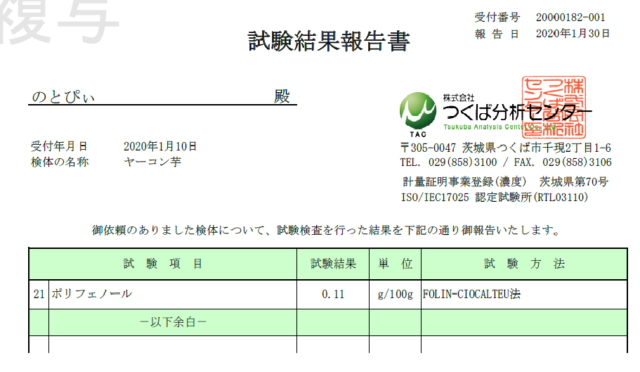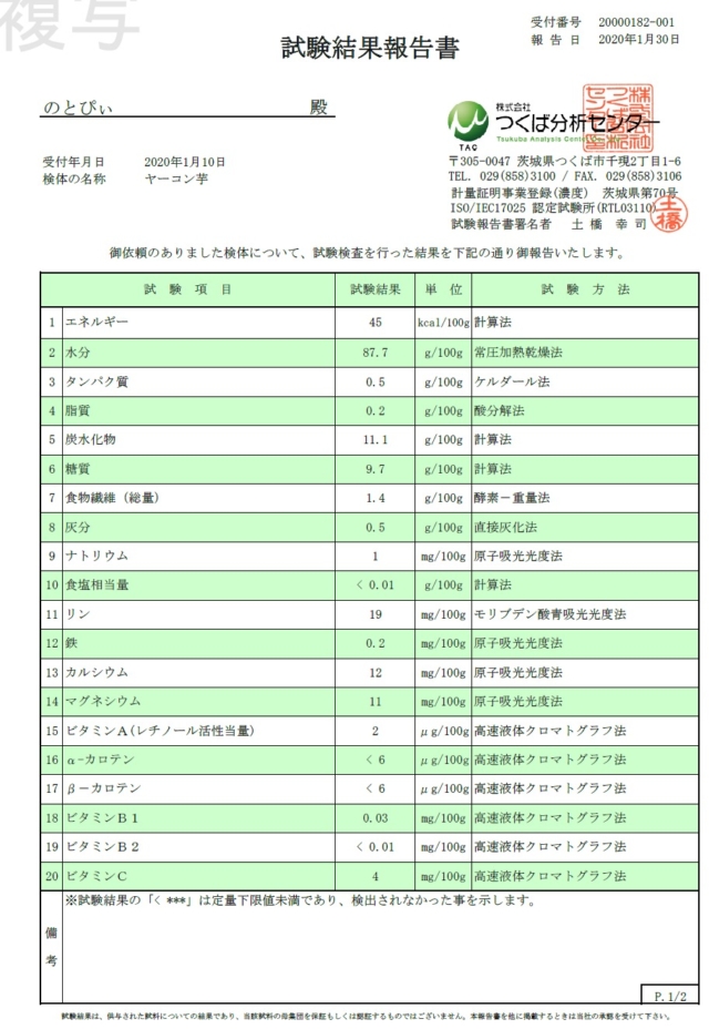 ヤーコンの栄養成分分析の結果が届きました-2020-01-31