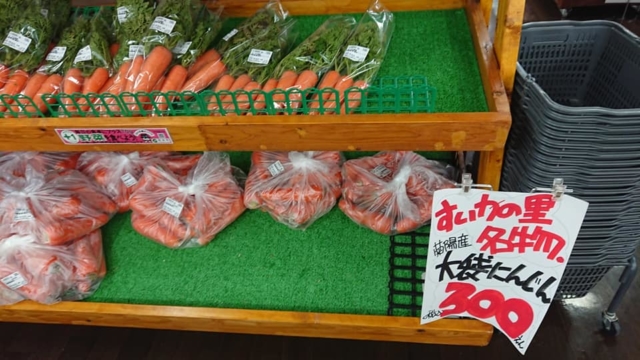 黄色いタイプのニンジンはスティックみたいな長細いほっそりしたものが、道の駅などでで通に売られています。下の2枚の写真は熊本県の道の駅植木で売っていた黄色いニンジンの袋詰めです。