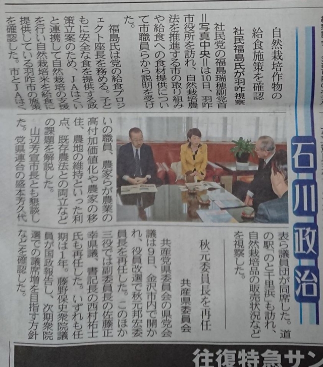 羽咋(はくい)市視察の福島瑞穂さんの新聞記事がありました-2020-02-11
