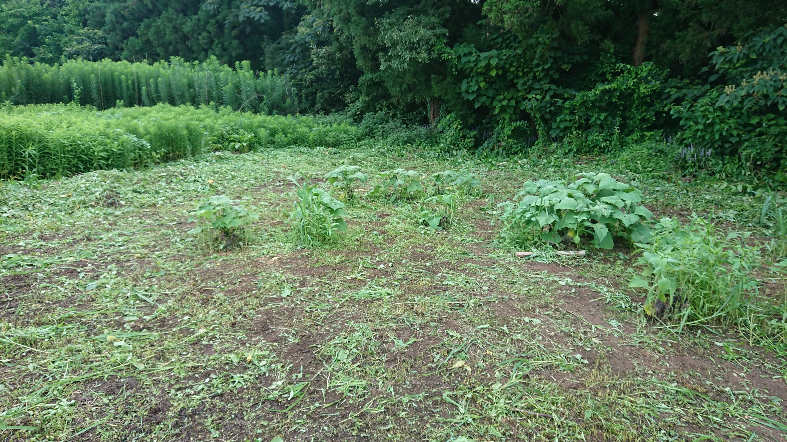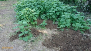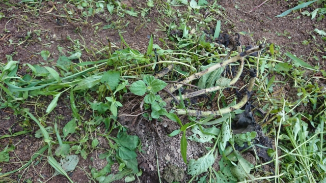 北國新聞の紙面に出ていたヤーコンの苗です。岐阜県のヤーコンおやじさんから譲ってもらったアンデスの乙女という品種です。1mくらいまで成長しました。前回の草刈りから何もしなかったら、草に埋もれていました。今日8/17(月)きれいにしました。一部ですが、イノシシの被害がありました。
