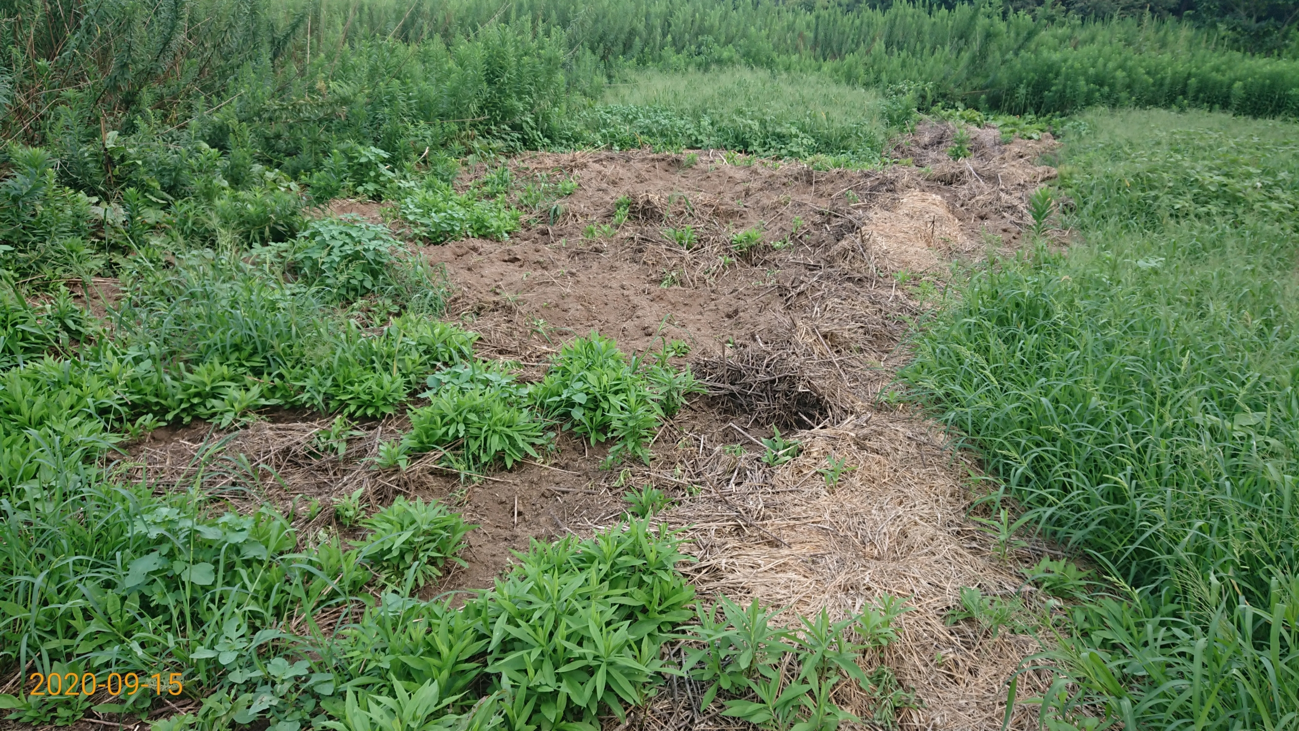 西洋わさびを植えている場所は、去年までは、数メートル先から掘り起こしていませんでした。今年初めてキクイモを植えてあるほ場の西洋わさびを掘り起こされました。西洋わさびを食べたあともありました。それで、その後の様子を見ていました。イノシシはえさ場だと認識したら、しつこく侵入して掘り起こして荒らします。昨日も確認しましたが、離れた場所までしか来ていませんでした。効果がありそうなので、ヤーコン畑にも西洋わさびを植えることにします。