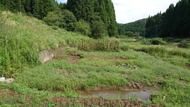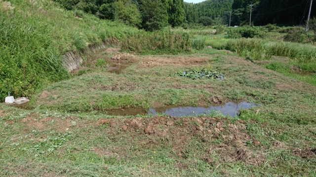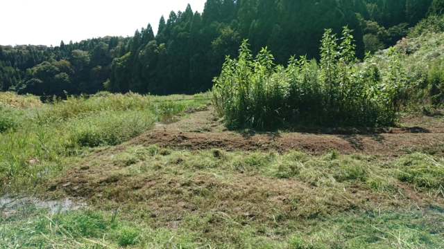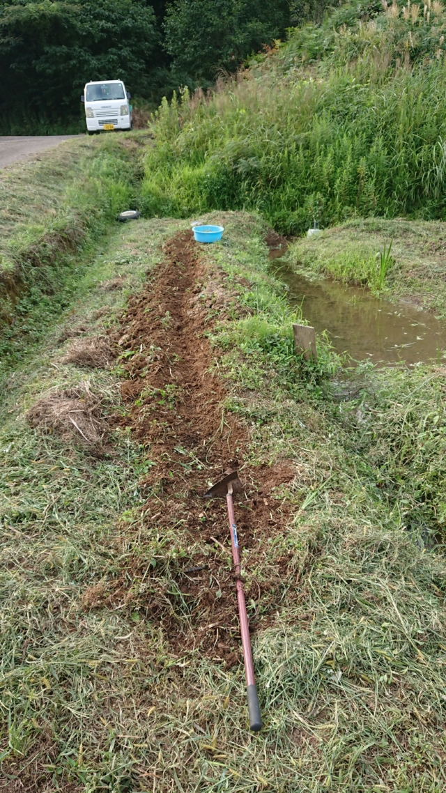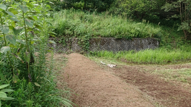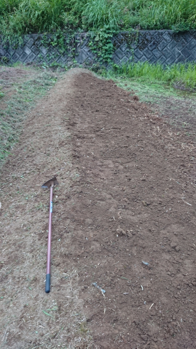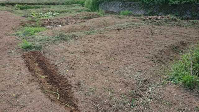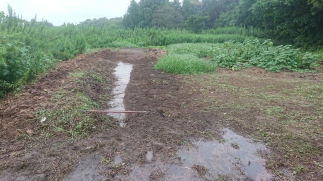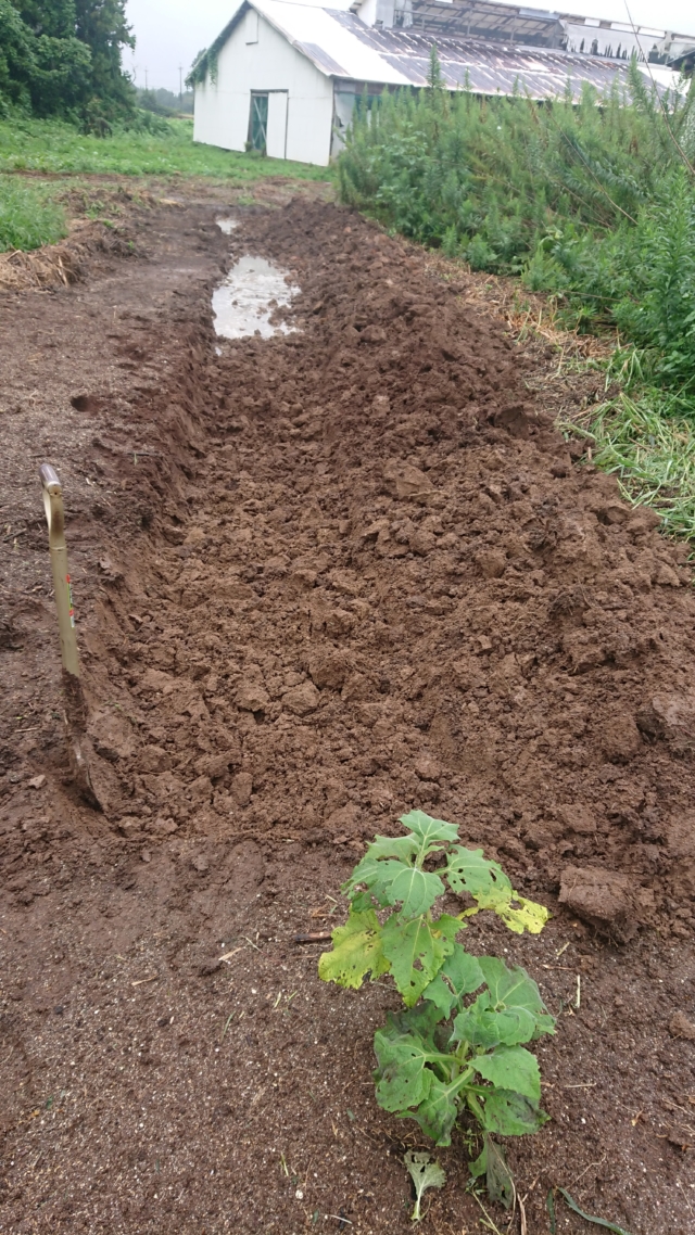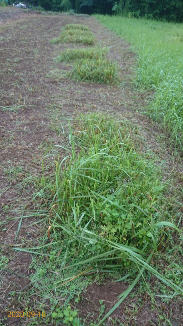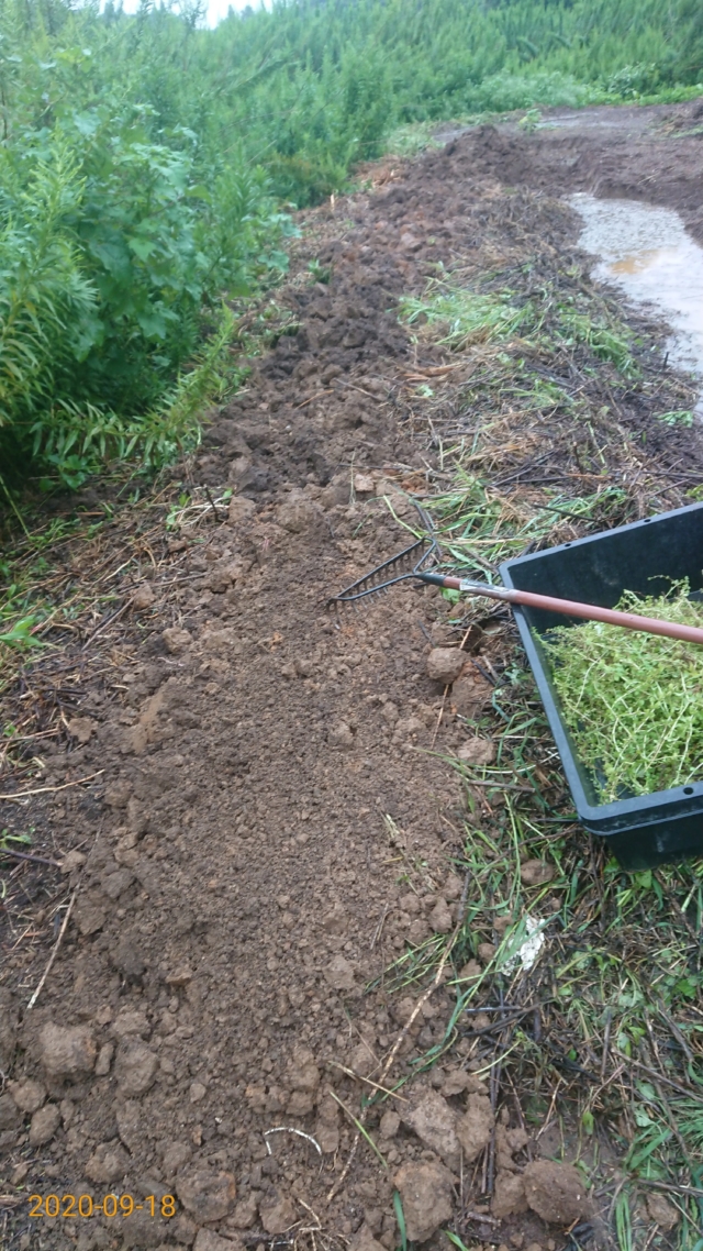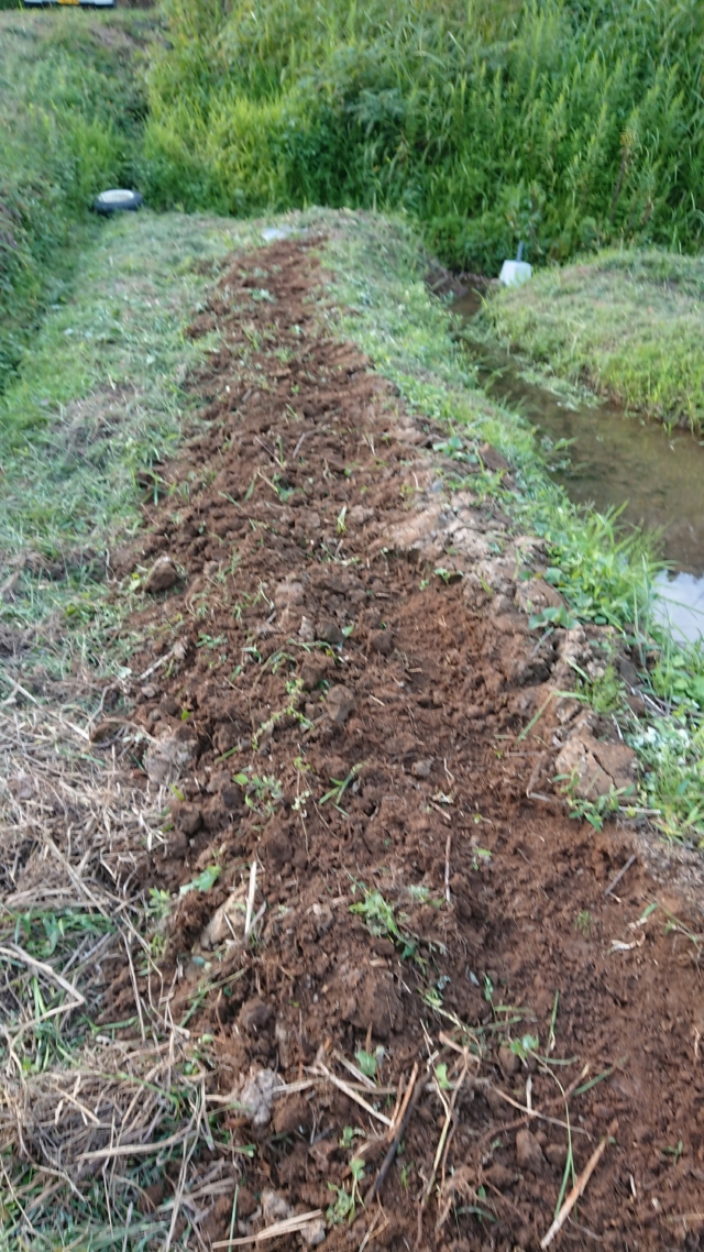 9月18日は穴水11号ほじょう。ヤーコンを栽培している区画です。境界沿いを溝を切って盛り土をして場所を作りました。高畝を作った状態です。溝を切ったのは、ペニーロイヤルミントはほふくして増えるので、勝手に畑の中に侵入しないようにするためです。