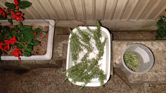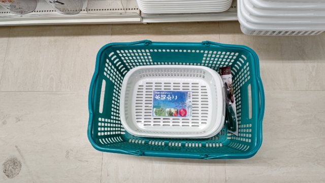 ダイソーでハサミと水切りカゴ買いました。暗くなってからですが、30本ほど枝先を切りました。下の方を手でむしってカゴに入れて水をはれば、完成です。