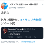 2021年1月10日 / 最終更新日時 : 2021年1月11日 shimasakimitsunori 日々是好日 アメリカ大統領選挙に関係する内容の発信は1月20日まで控えます-2021-01-10 トランプ大統領の発信するツイッターアカウントが、個人からホワイトハウス大統領公式アカウントに変わった点に注目。重要な内容を発信している。個人のアカウントは確かに凍結されていますが、このホワイトハウス大統領公式アカウントの […]