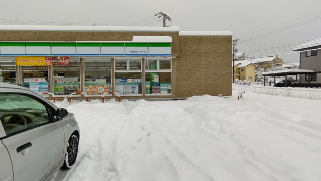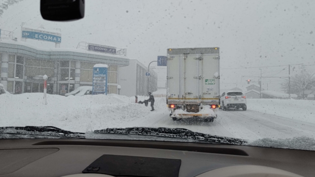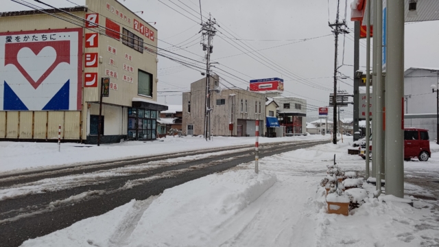 能越道は氷見北インターで降りました。積雪と除雪をした跡で路面の状態が悪くて、万が一渋滞したら閉じ込められるからです。一般道だとコンビニ行ったりGS行ったりできますね。