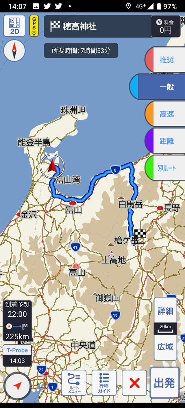 これは私が使っているトヨタのスマホナビアプリです。七尾市能越道城山インターから穂高神社までは225kmらしいです。たぶんこのナビどおりには走らないと思います。目安です。14時03分出発で22時到着予想なので、225kmを8時間でわると約28km/hです。移動速度が遅いように感じますが、途中に休憩を入れたりすると実際はこのくらいになります。私がトヨタのスマホナビアプリを使っている理由はこの余裕のある到着予想です。