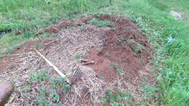 雨の中、ヤーコンとキクイモ用の畝を作ってました。