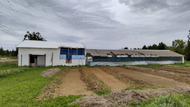 台風や大雪で建物が傷んでいましたが、できるだけコストをかけずに安全に修繕する方法をずっと考えていました。反対側の入り口は、数年前にポリカ波板を張り合わせて扉を作りましたが、強風で壊れました。それで今も開けたままです。さんざん悩んで考えた結果、防風ネットを使うことにしました。どこまで効果があるか分かりませんが、ちょっとこれで台風シーズンを乗りきれるか様子を見てみます。