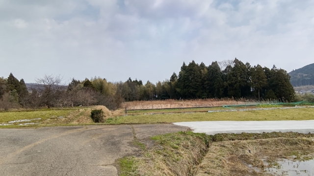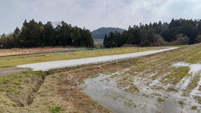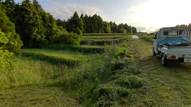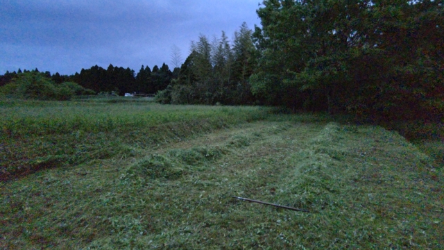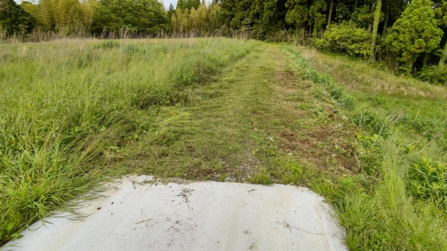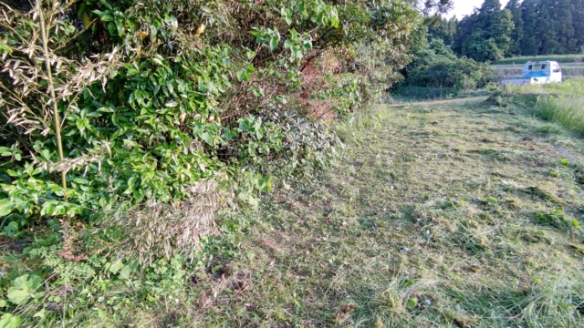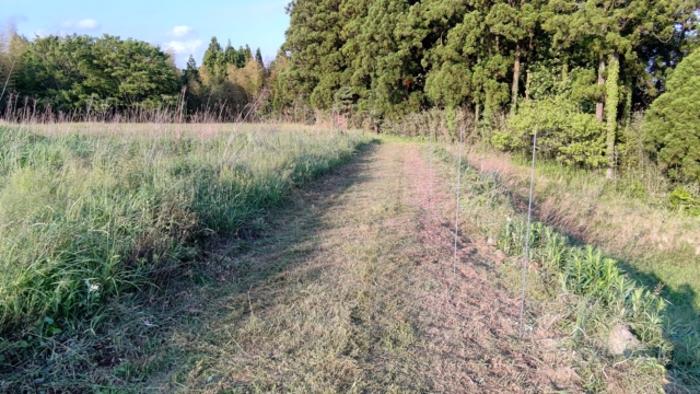奥にある畑の草刈りをするために、通った道を先に草刈りしました。それで右側が削れていることに気づきました。右側は10m以上の高さがある斜面なので、このまま車で通行すると下に落ちるかもしれません。応急措置をしました。夜間反射するトラテープを2mの鉄芯に巻きつけてあります。