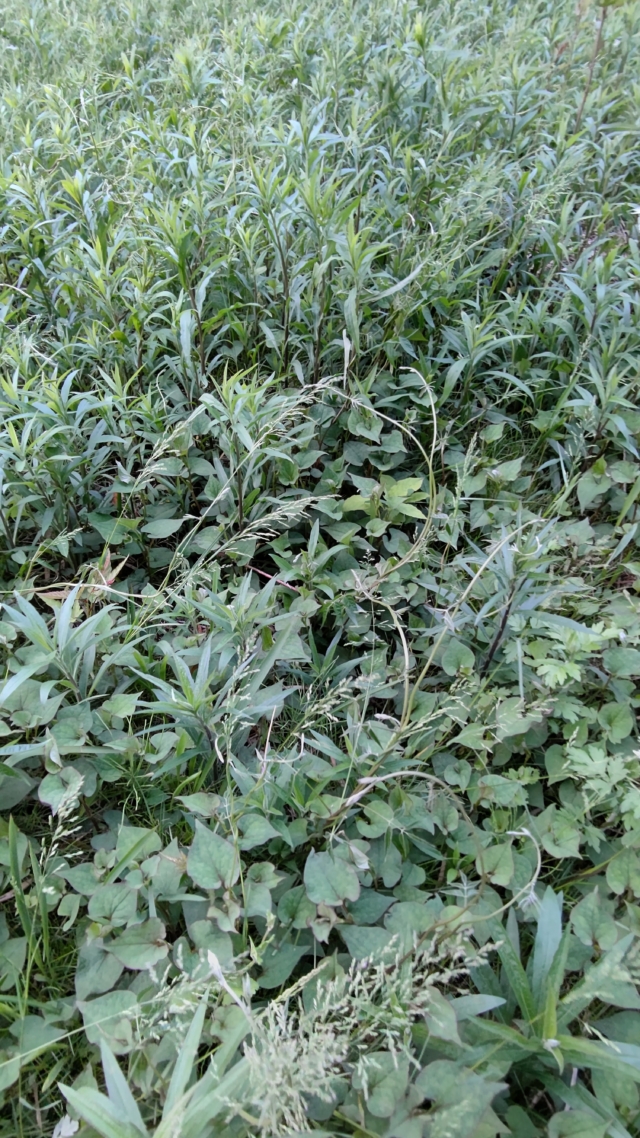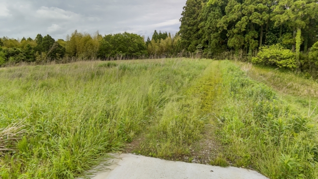 今年の2月21日に上の道が舗装されているのに気づきました。この舗装された道幅で進むと右下の崖に多分落ちます。面倒でも先に草刈りをした方が安全ですね。これからは、マムシなどの毒蛇やアシナガバチなども草むらに潜みます。ひざ以上の草むらに入るときは気をつけた方がいいです。