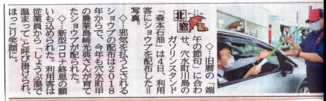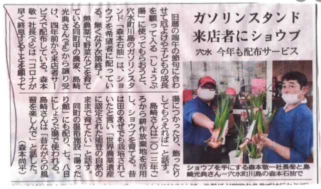 (2021年6月5日 北陸中日新聞能登版 ガソリンスタンド来店者にショウブ)