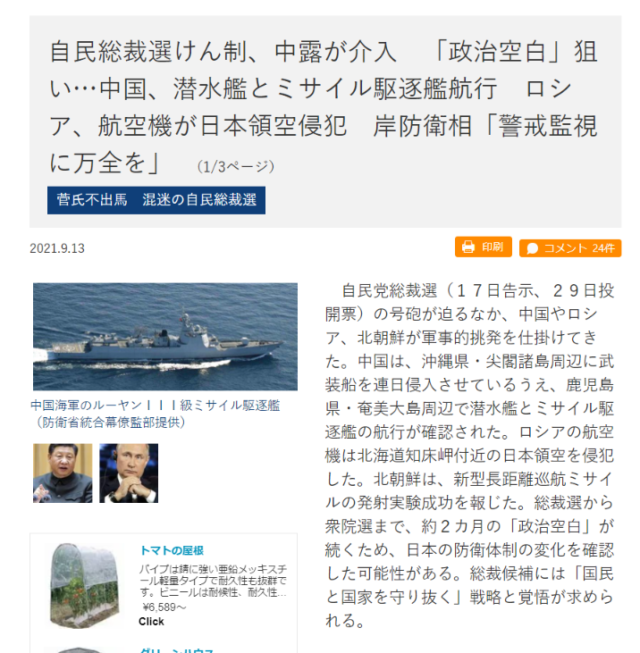 (9月13日 中国、ロシア、北朝鮮が軍事活動を活発化させる)