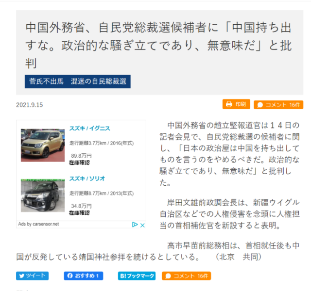 (9月15日 中国外務省がどうたらこうたら。中国外務省は中国共産党よりも格下の組織です)