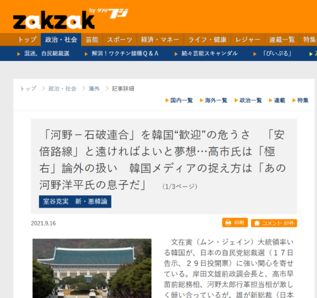 (9月16日 韓国は河野さん希望)