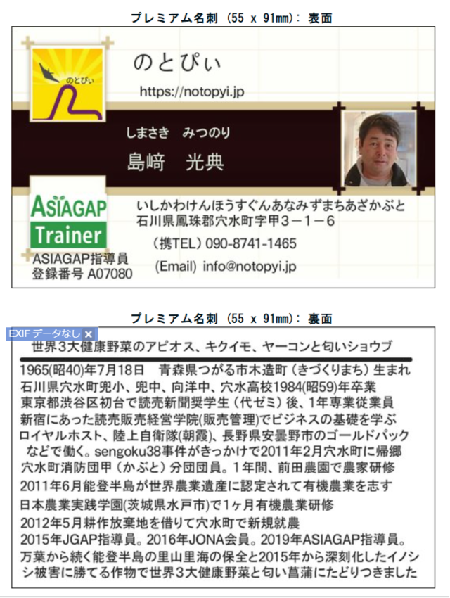 今使っている名刺は、試作中だったこともあって取り扱い作物をハッキリと書いていません。けれどもこの10年間の試行錯誤の結果、方向性が見えてきたので名刺を作り変えることにしました。昨日ビスタプリントさんに発注したので、来週には届きます。