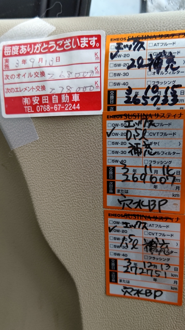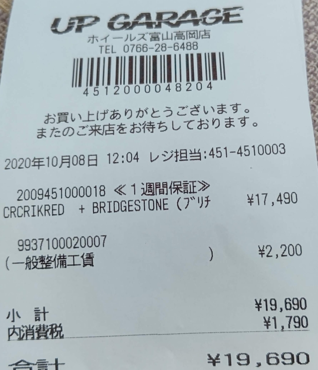 今日の夜から本格的に雪になるらしい。この車は27万キロ以上走っていて廃車にする予定だったので、去年10月に高岡店で買った中古のオートバックスのアイスエスポルテを夏もずっとはいていました。今は大体月に3千キロ運転するので、14ヶ月で4万キロ走ったことになります。春まで乗るかもしれないので、魚津店で中古のヨコハマのアイスガードに取り替えました。タイヤの脱着工賃だけなのでプラス4千円ですね。