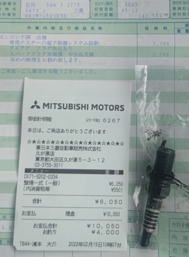 第一京浜を走行中にエンジンの故障で東京のディーラーの整備工場で応急修理をしてもらったときが14万2533km。
