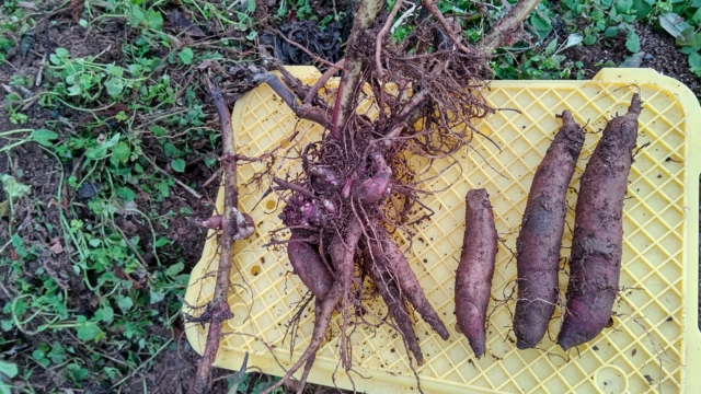 赤紫色のヤーコンイモでした。50から100グラムほどの3本でしたが、やっぱりイモの表面(肌)がきれいです。在来品種は大きく育ってくると表面が割れる(裂ける)ということが問題になっていましたが、これ(イモの肌がきれい)は能登半島の赤土のせいでしょう。
